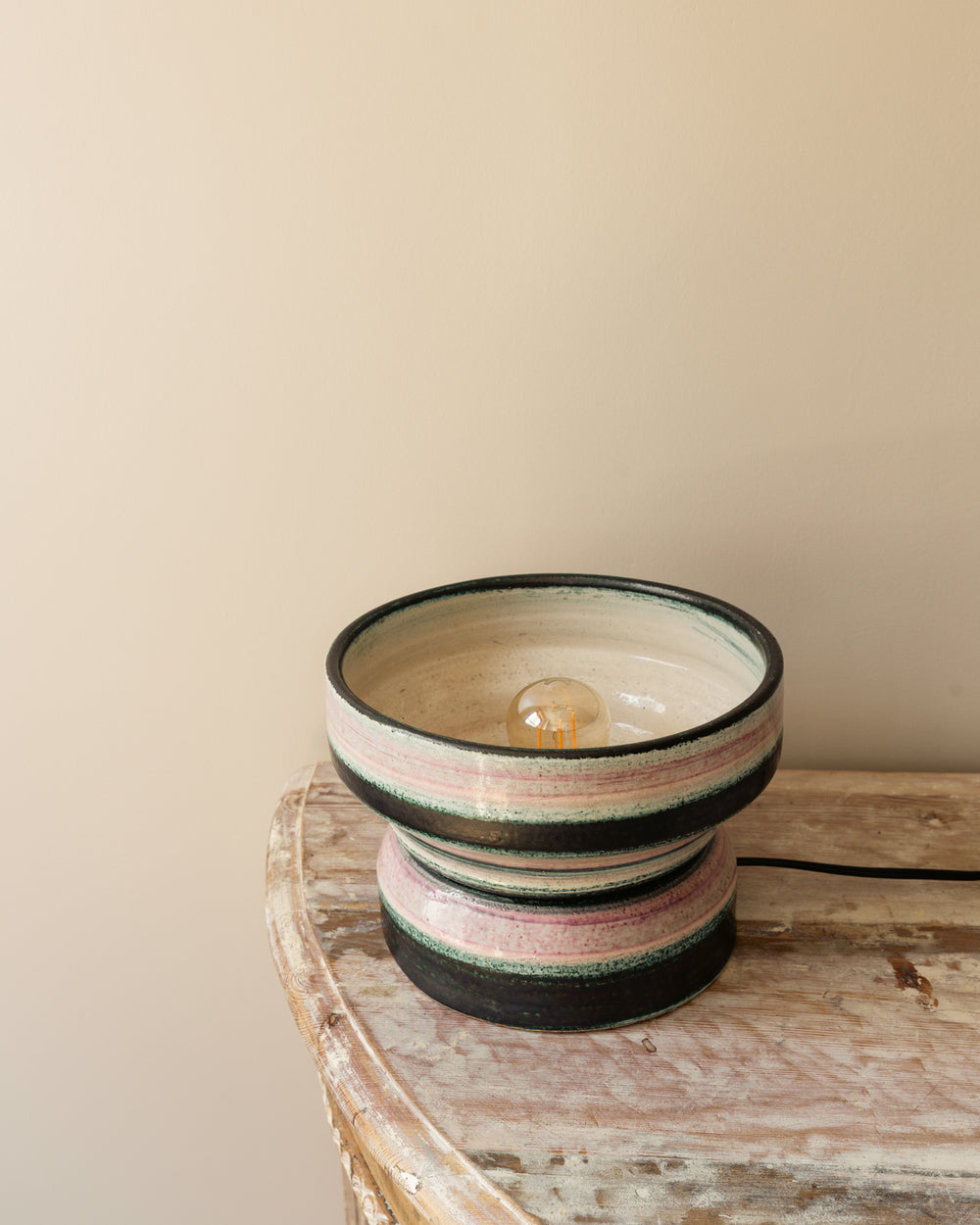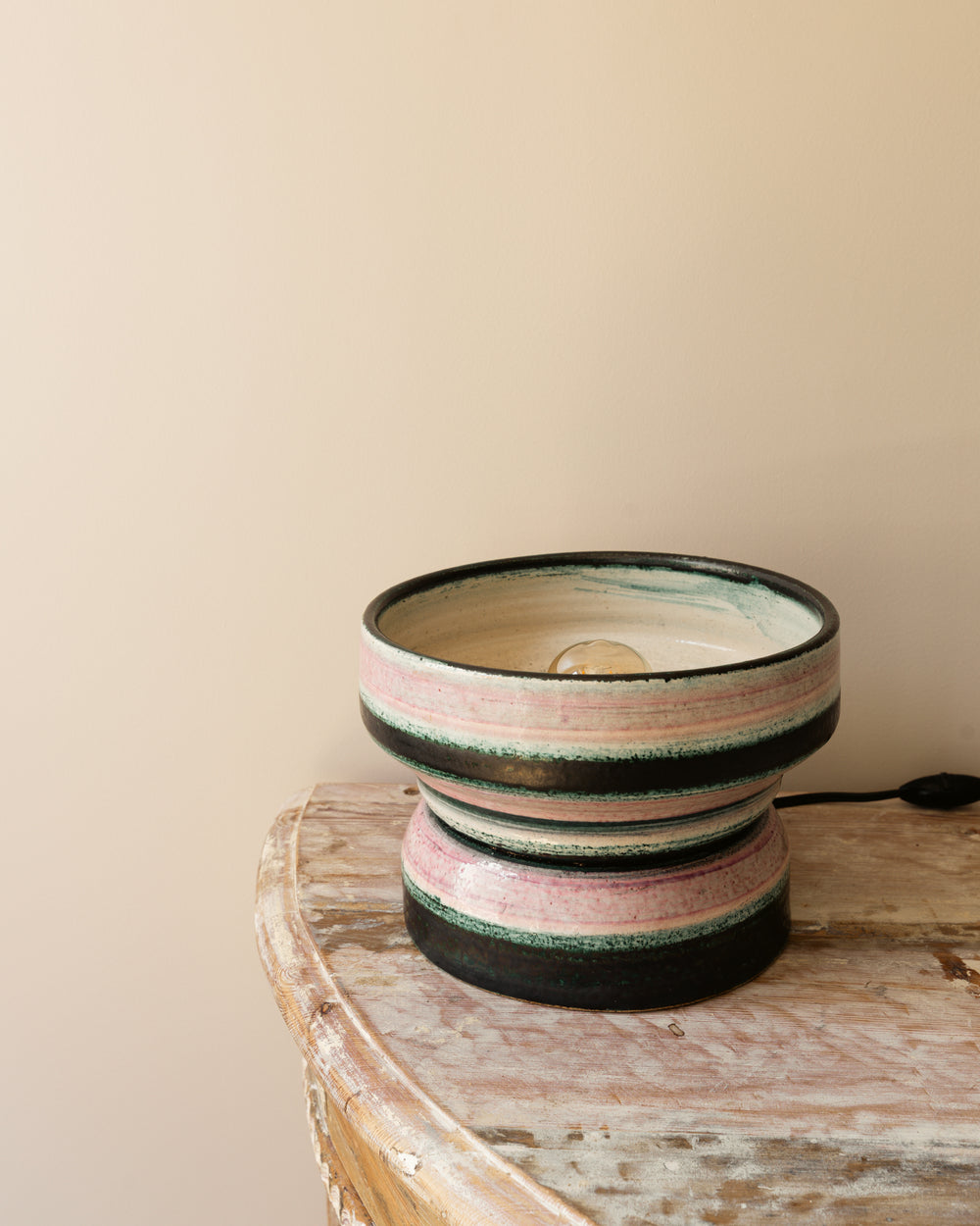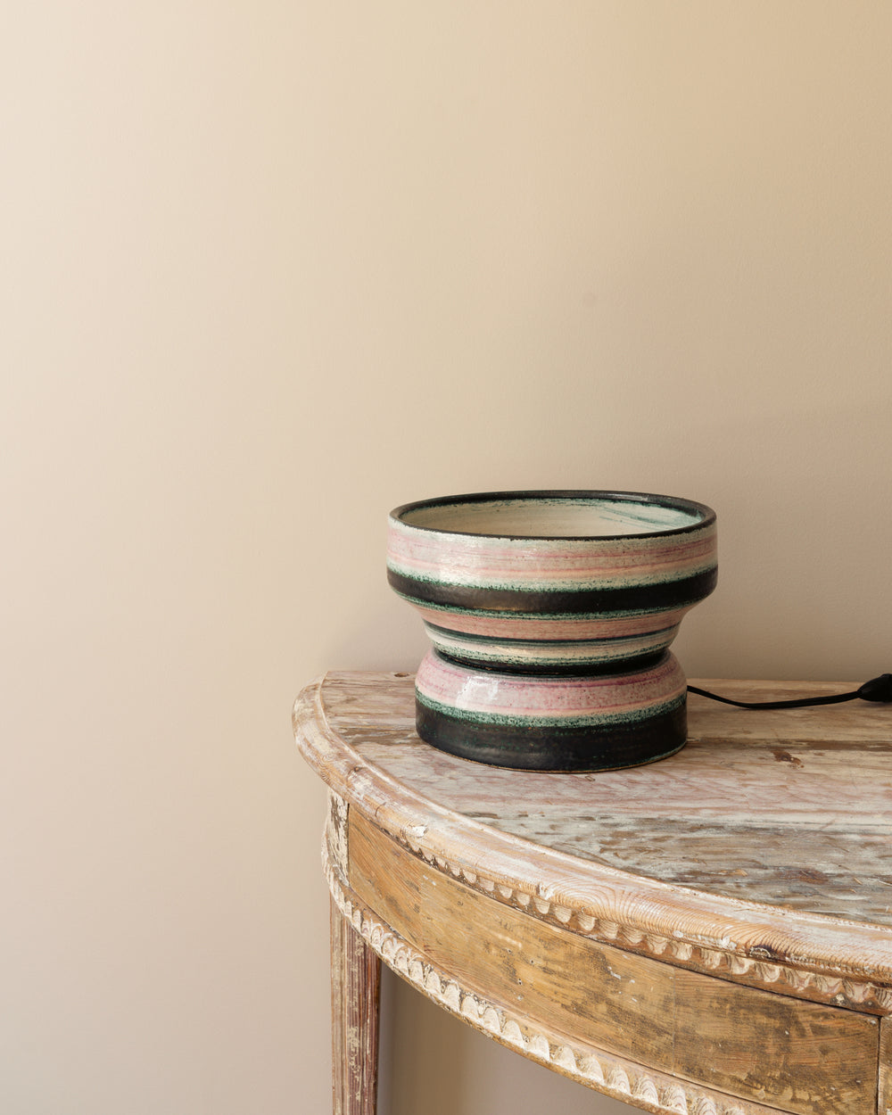 This example features a stepped cylindrical profile with alternating bands of pink, green, and cream — a palette typical of his work, with tonal contrasts and muted yet luminous colors. Wired for EU; will be rewired for the US after purchase.