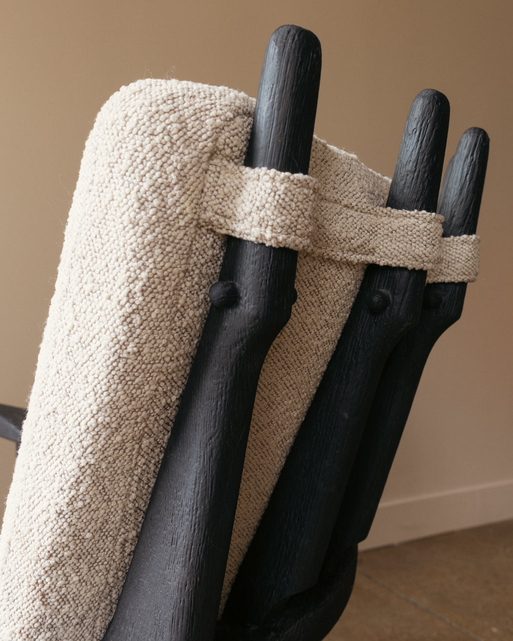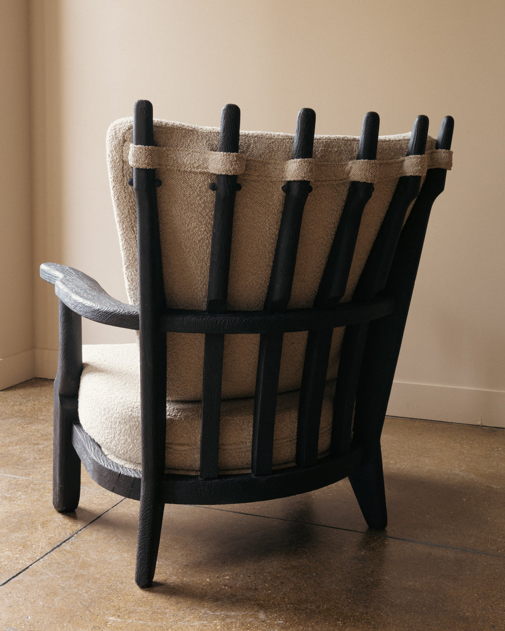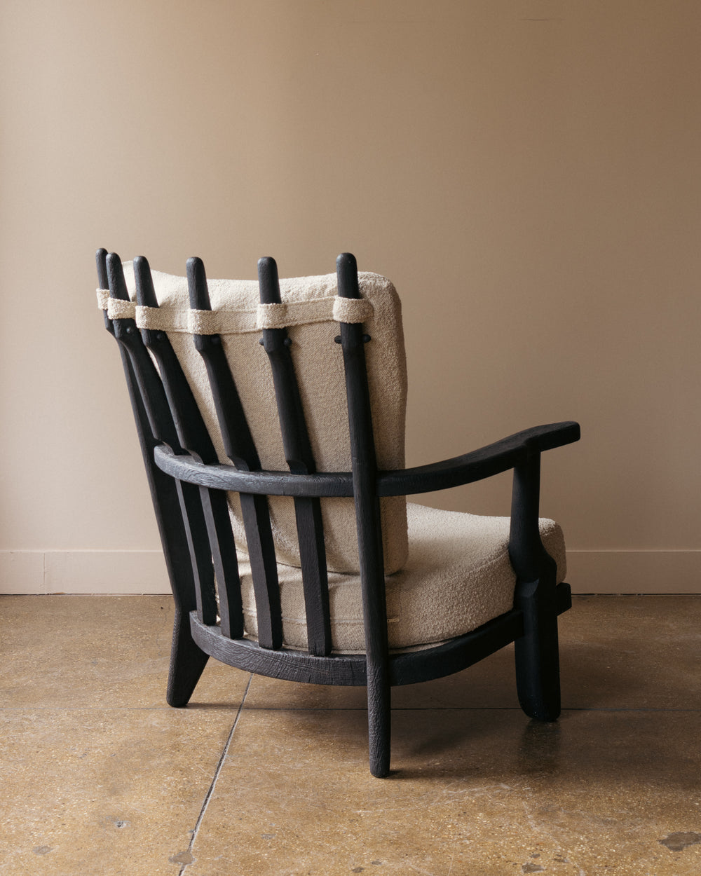 A Mid Repos lounge chair by Guillerme and Chambron for Votre Maison, distinguished by its row of elongated, sculpted oak back supports and gently curved armrests. The frame has been ebonized, emphasizing the carved texture and graphic silhouette that define the model. Upholstered cushions in an off-white bouclé rest against the vertical back elements, highlighting the contrast between the chair’s robust oak structure and its soft, enveloping seat.