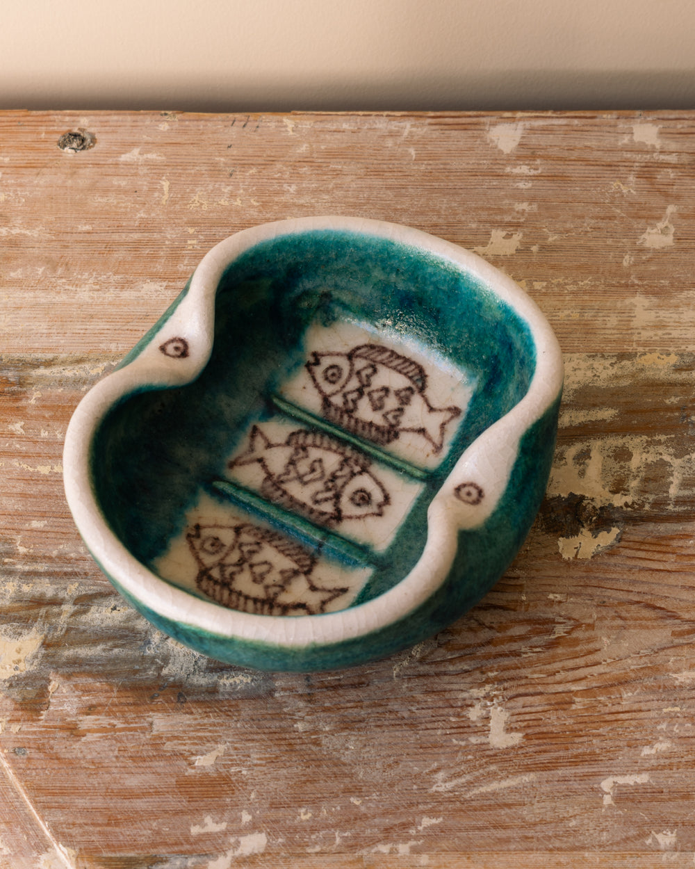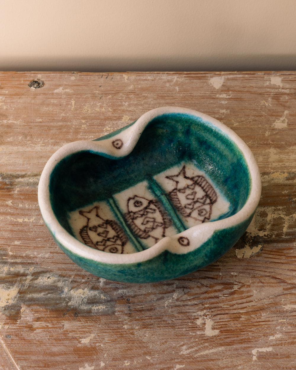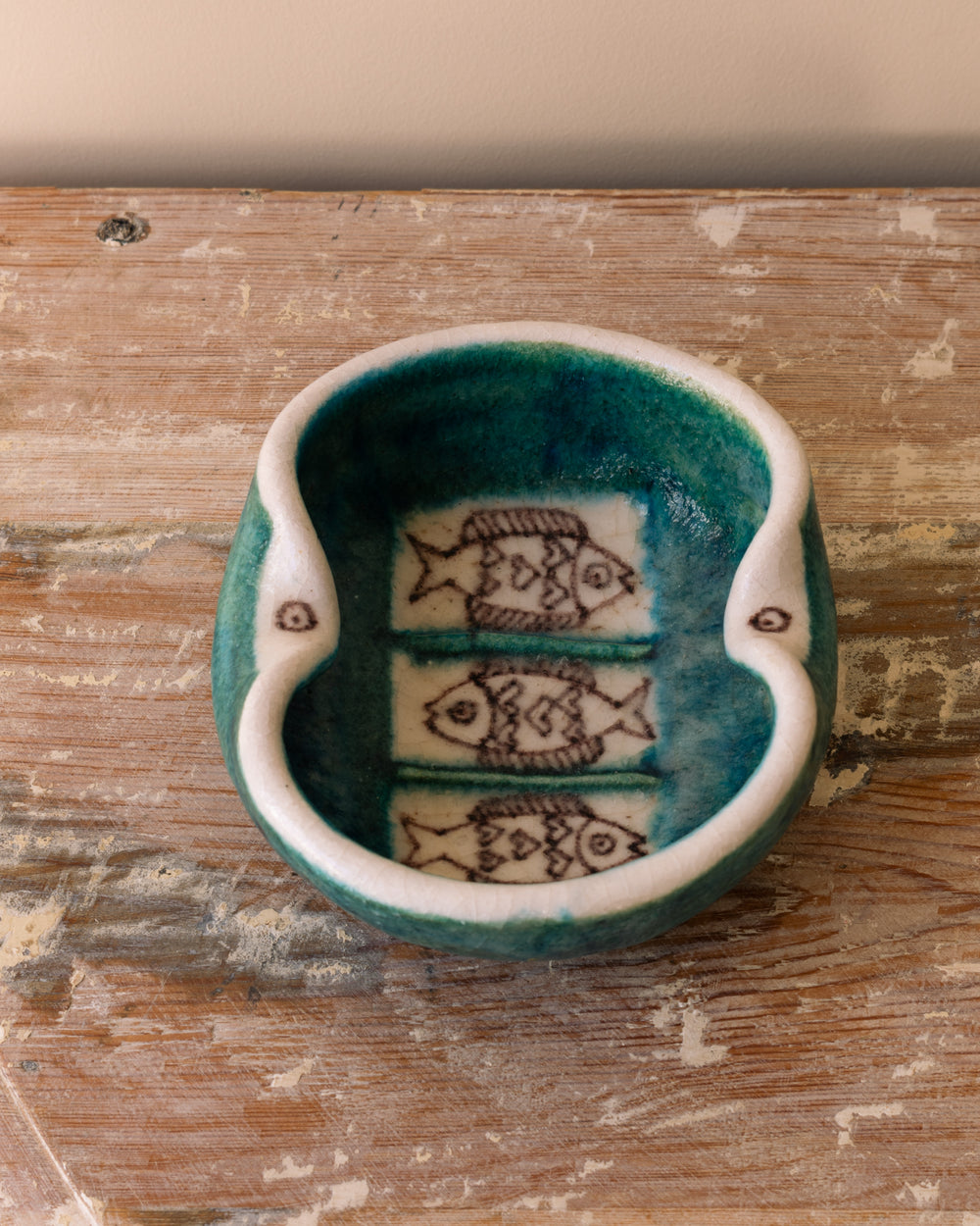 A ceramic bowl by Guido Gambone, signed to the underside. The interior features Gambone’s hallmark figural decoration drawn in green over a cream ground, surrounded by areas of purple glaze with fine craquelure throughout. The design reflects Gambone’s distinctive mid-century vocabulary—linear, hand-painted imagery that bridges Italian folk art and modern abstraction.