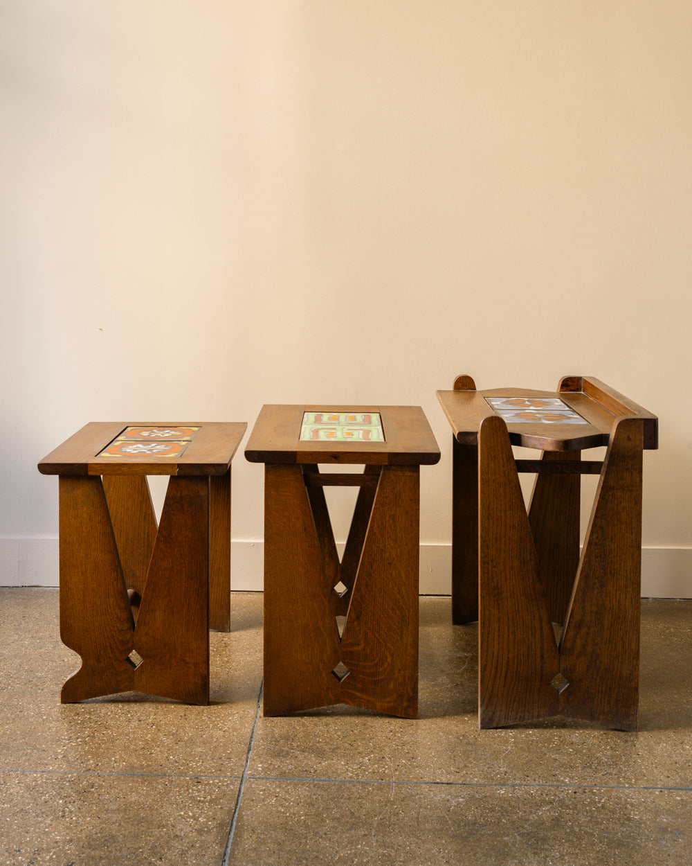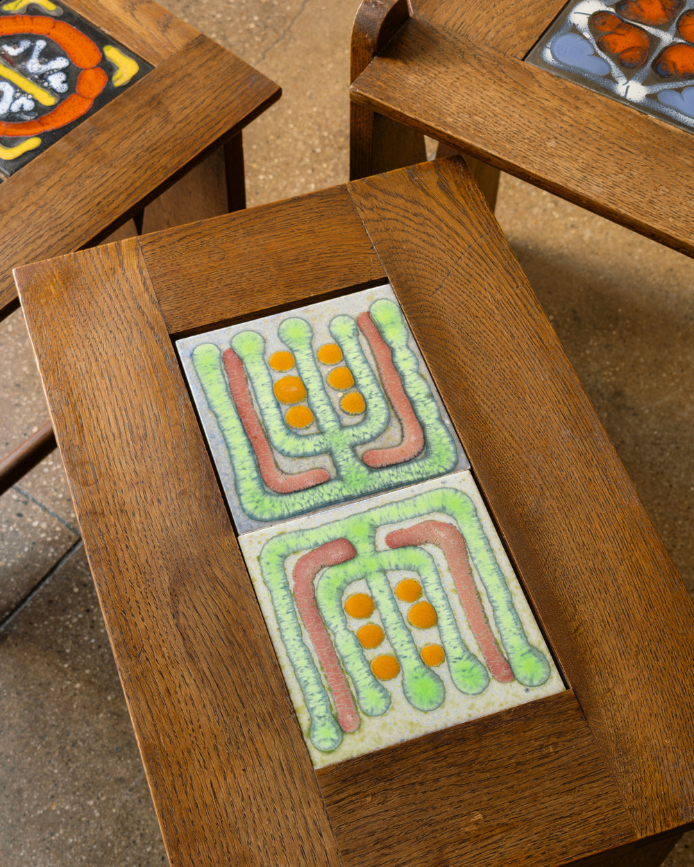 Each stained oak table features distinctive angular legs joined by stretchers, with the tabletops inlaid with vibrant geometric and organic ceramic tile designs in contrasting color palettes. The tiles are attributed to Boleslaw Danikowski, a frequent collaborator of the designers and have some small chips.