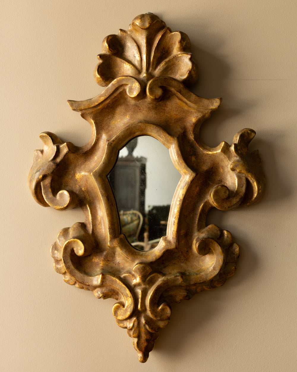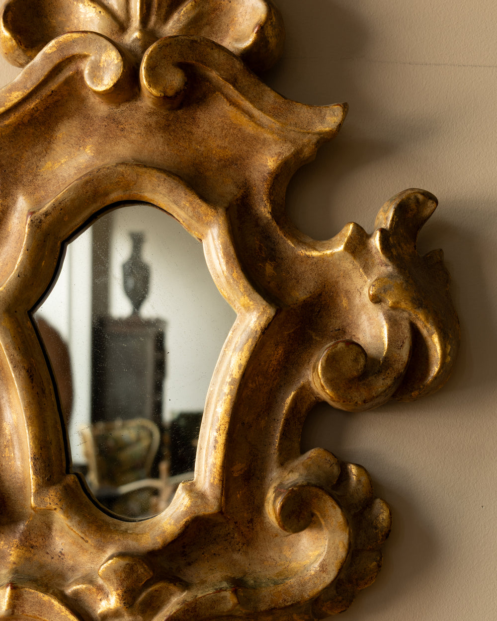 The mirror plate has a lightly aged surface consistent with its period character. A decorative accent that embodies the ornate movement and asymmetry characteristic of the Rococo aesthetic.