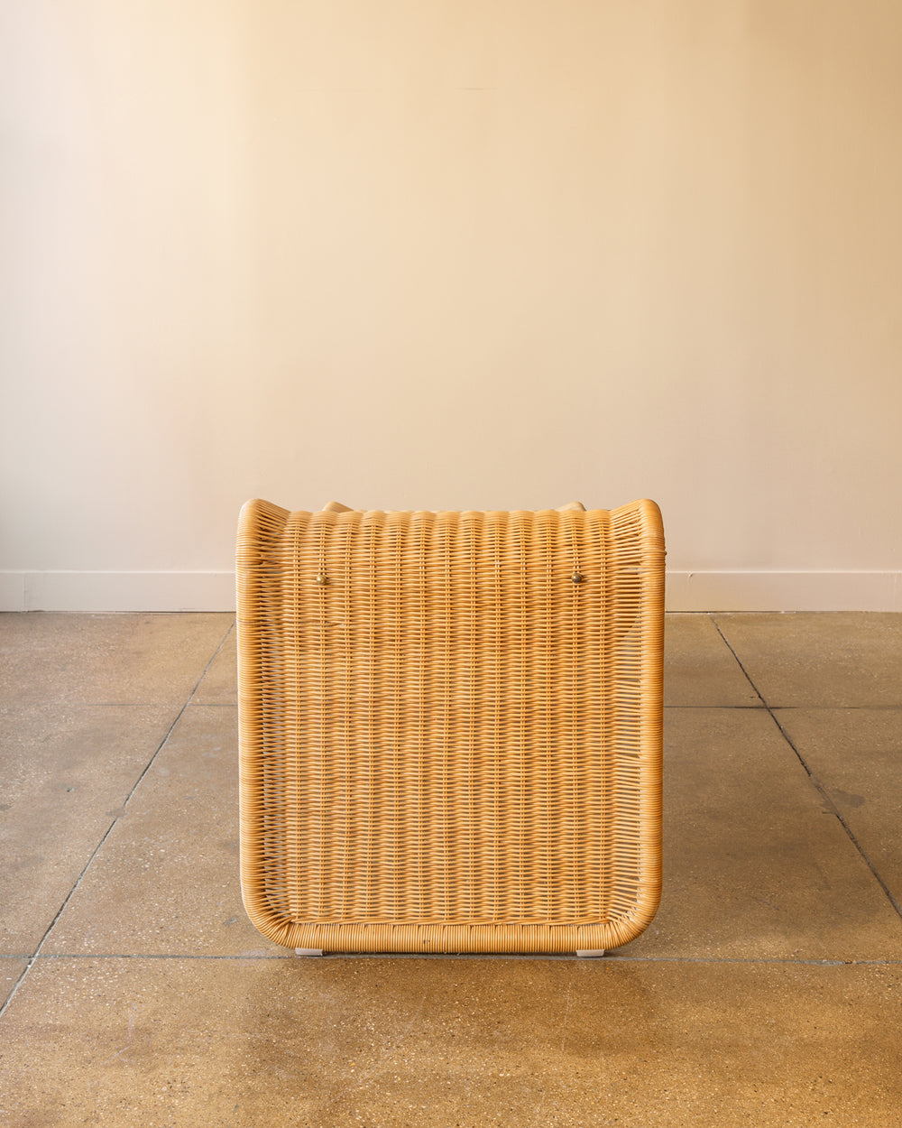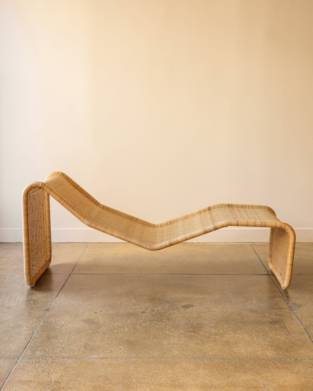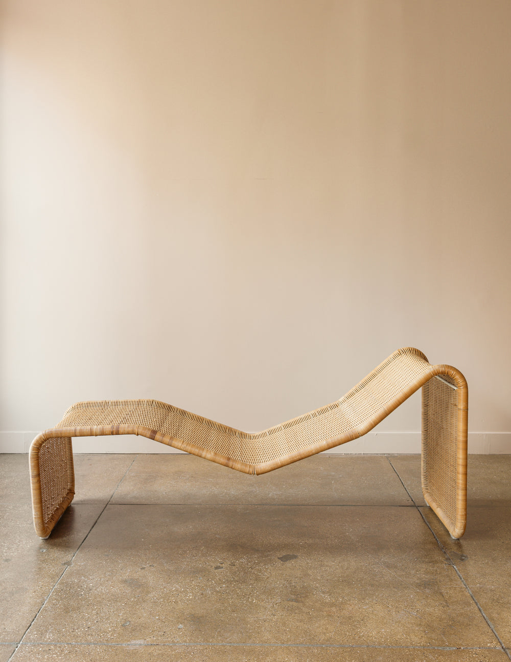 Wicker chaise longue by Tito Agnoli for Bonacina, Italy, 1960s. Agnoli, a Peruvian-born architect and designer who studied with Gio Ponti, was known for his restrained, functionalist approach. His collaboration with Bonacina 1889, the Brianza atelier famed for its cane and rattan craft, produced enduring icons of postwar Italian design.