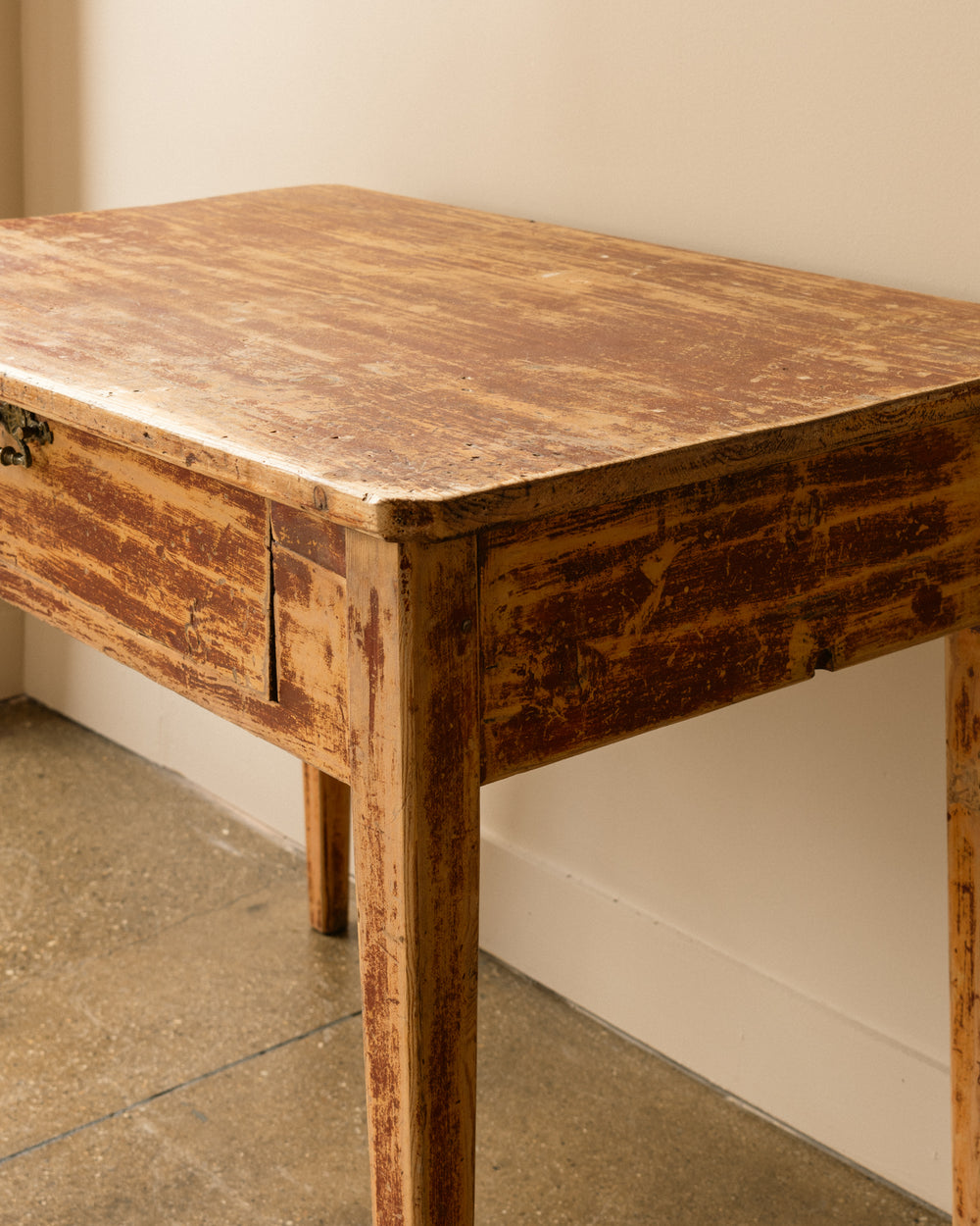 A 19th-century painted pine table, Sweden. Built in a simple vernacular frame construction, it reflects the utilitarian clarity of rural Scandinavian design. The surface bears age marks, stains, and colour losses, forming an attractive patina that speaks to its long use and history.