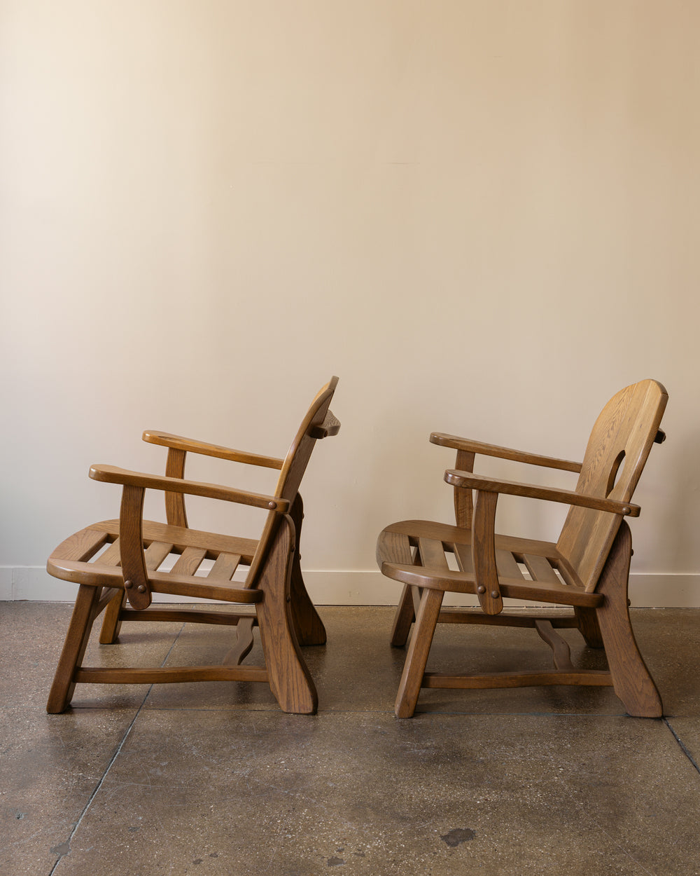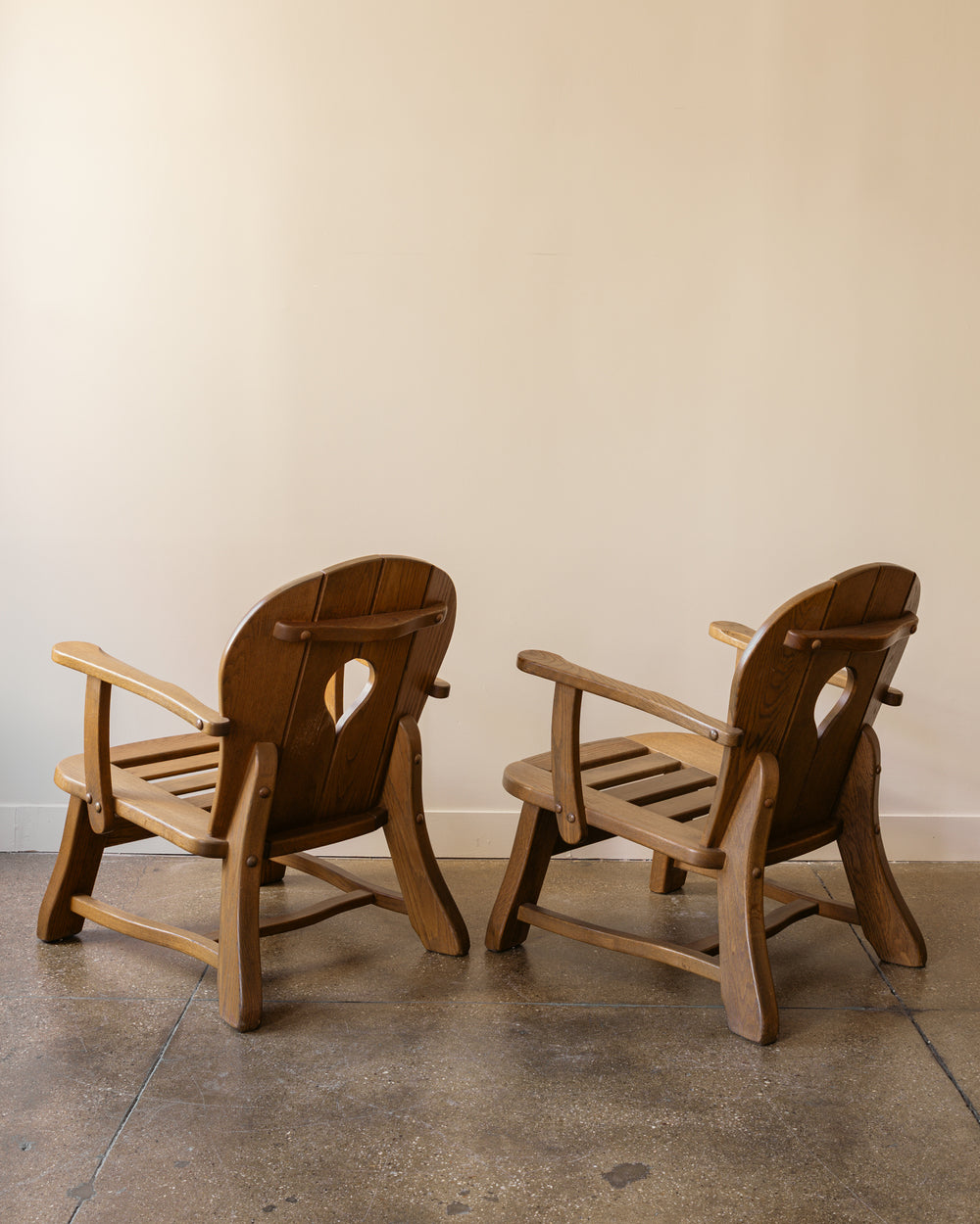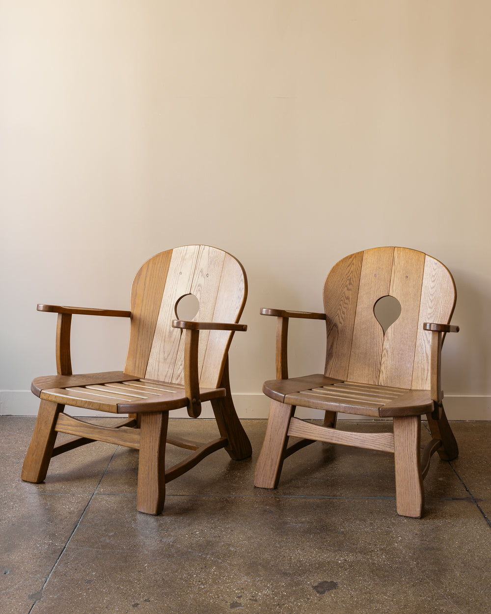 A pair of French oak lounge chairs from the 1960s in the Brutalist style. Each chair features a solid, low-slung frame with a wide seat, gently curved backrest, and signature keyhole cutout.