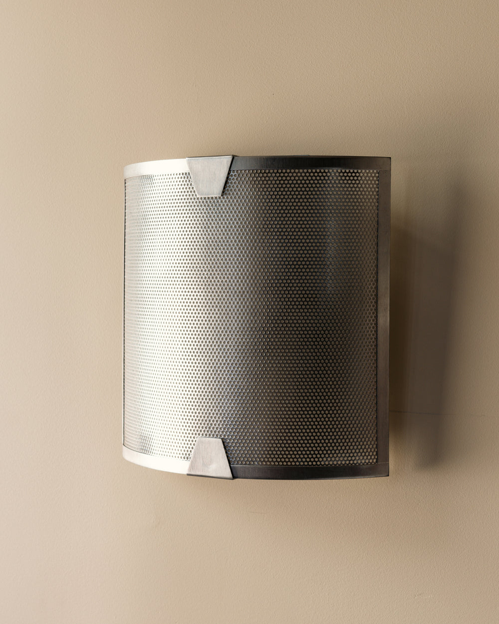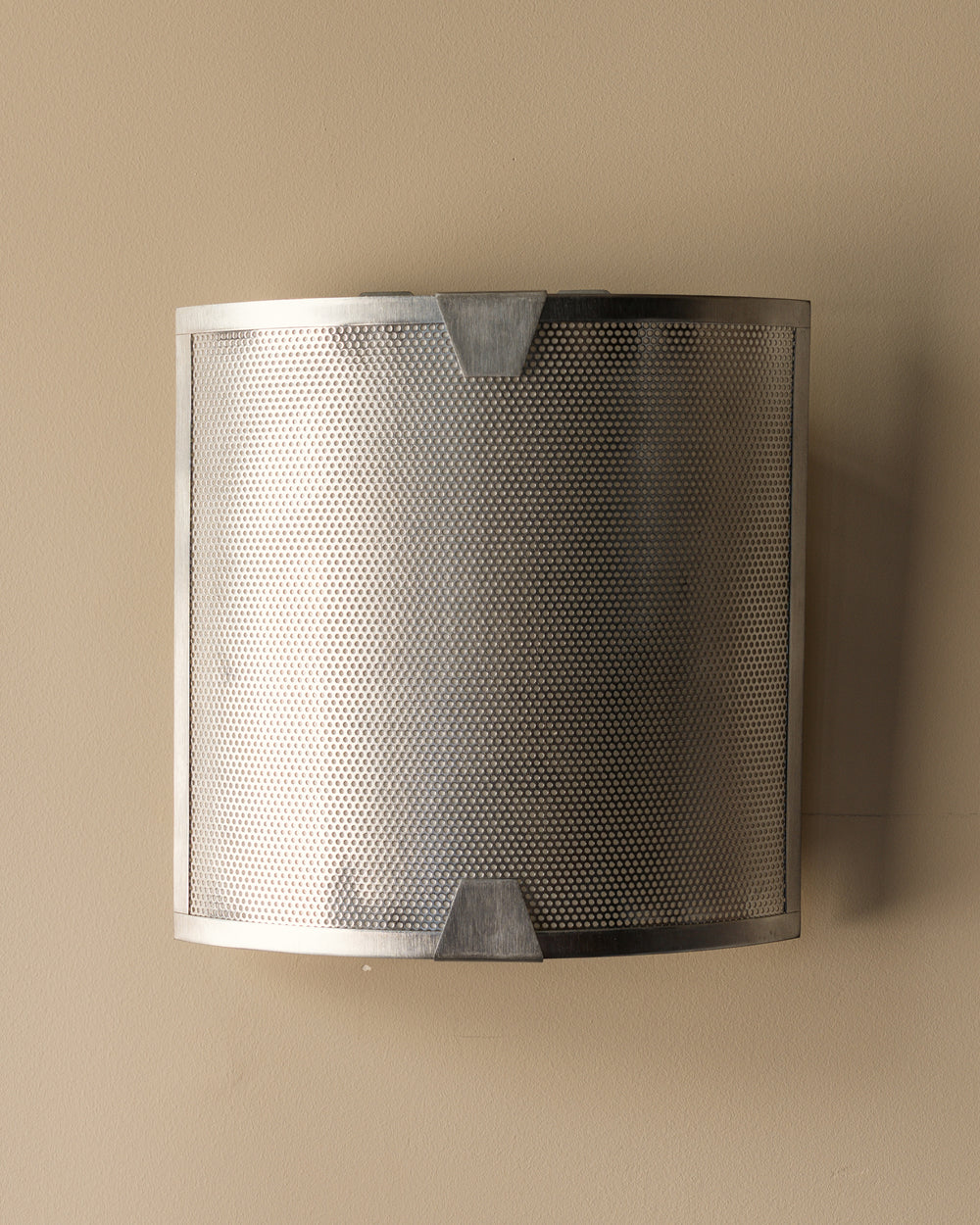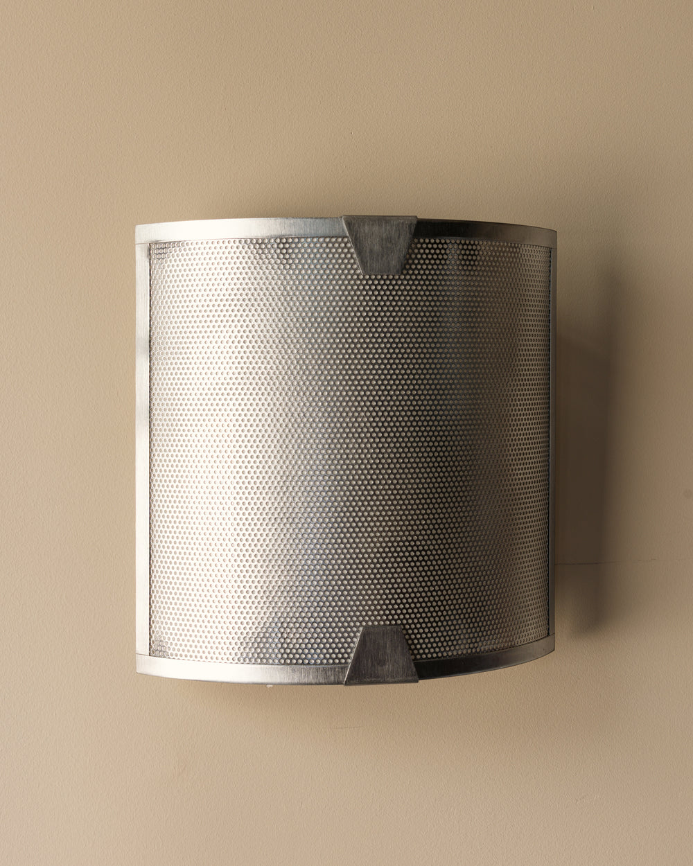 A wall-mounted sconce in brushed aluminum with a curved, perforated diffuser. The design combines industrial materiality with balanced geometry—the gently bowed shade softens the light through its perforated surface while maintaining an architectural presence.