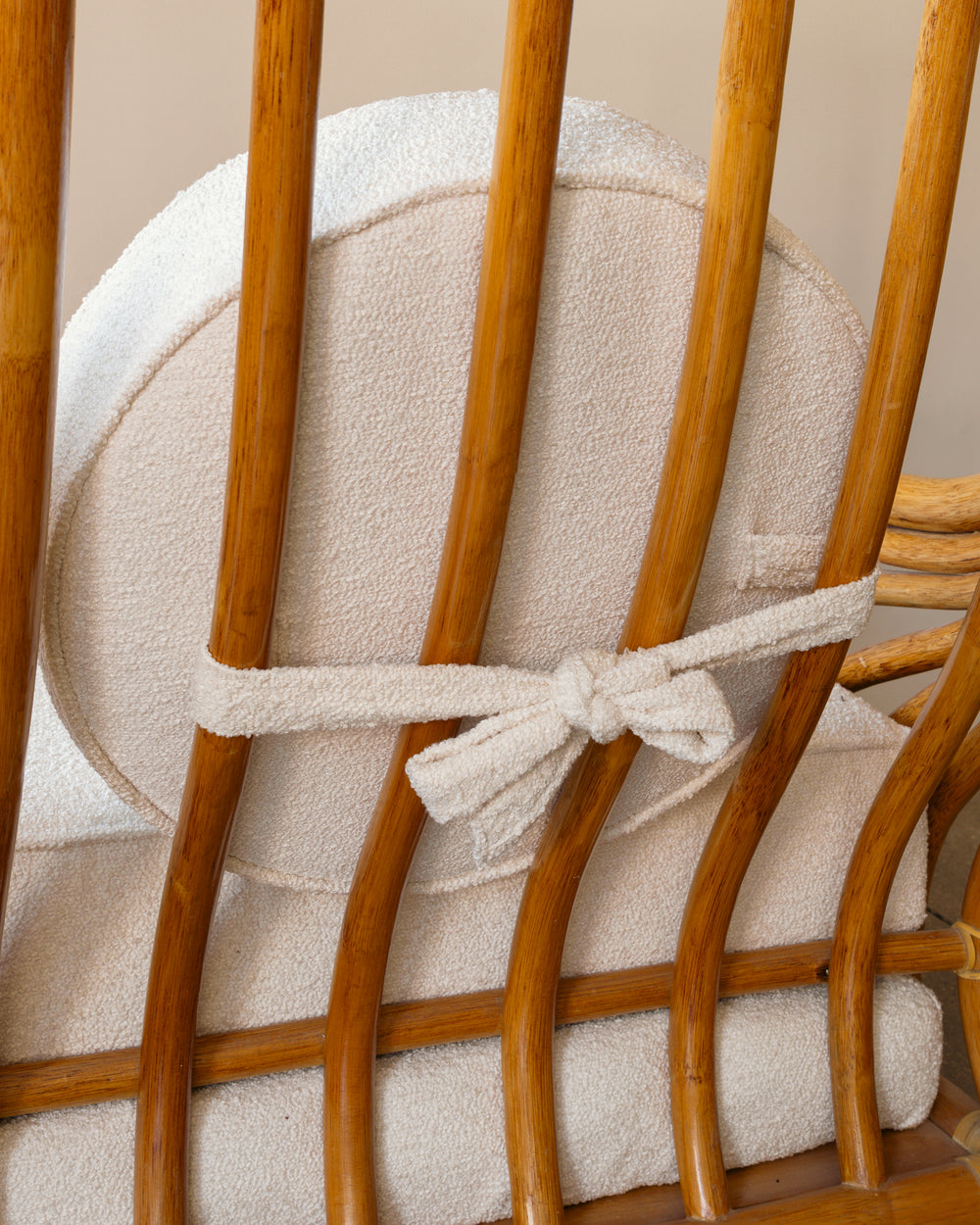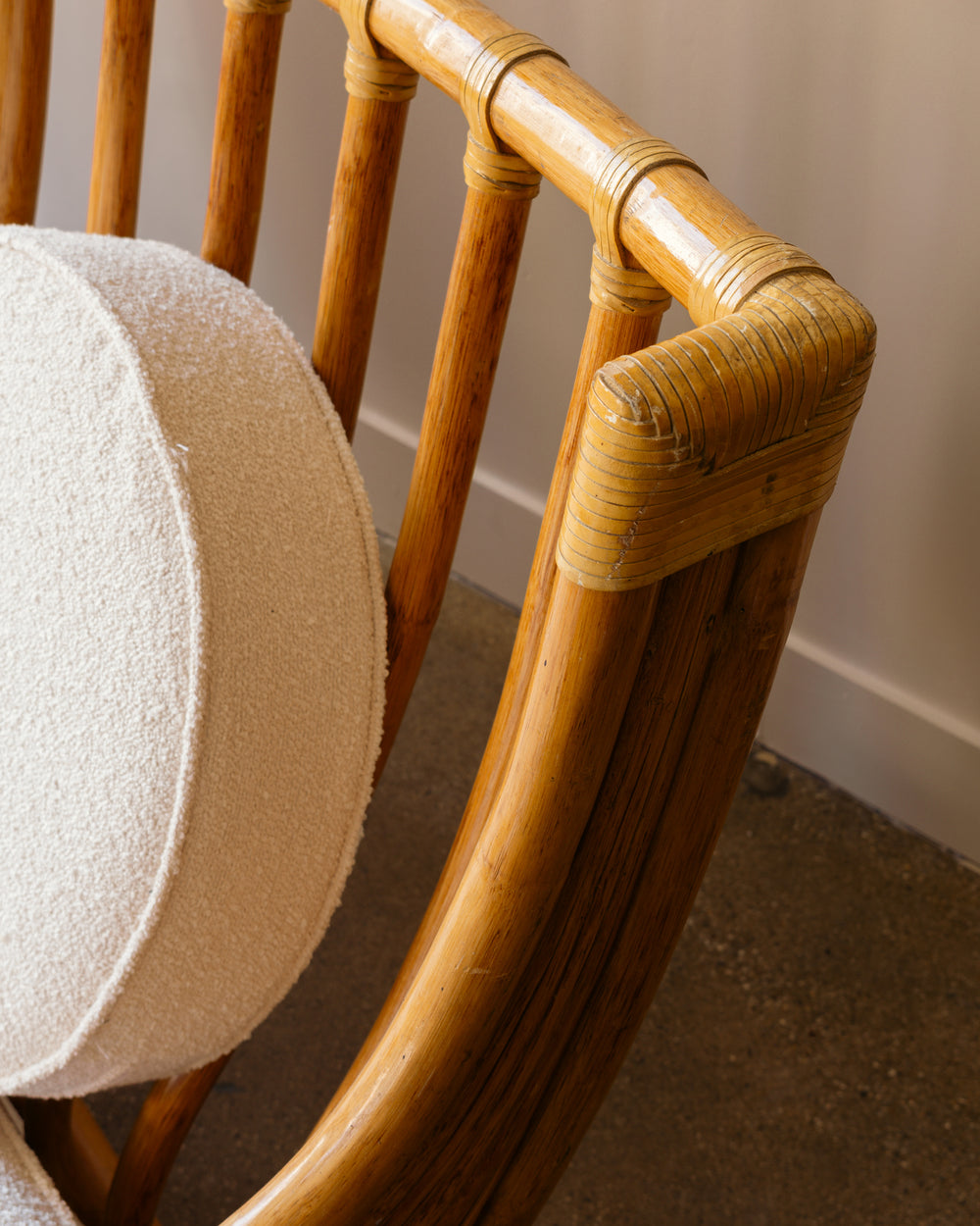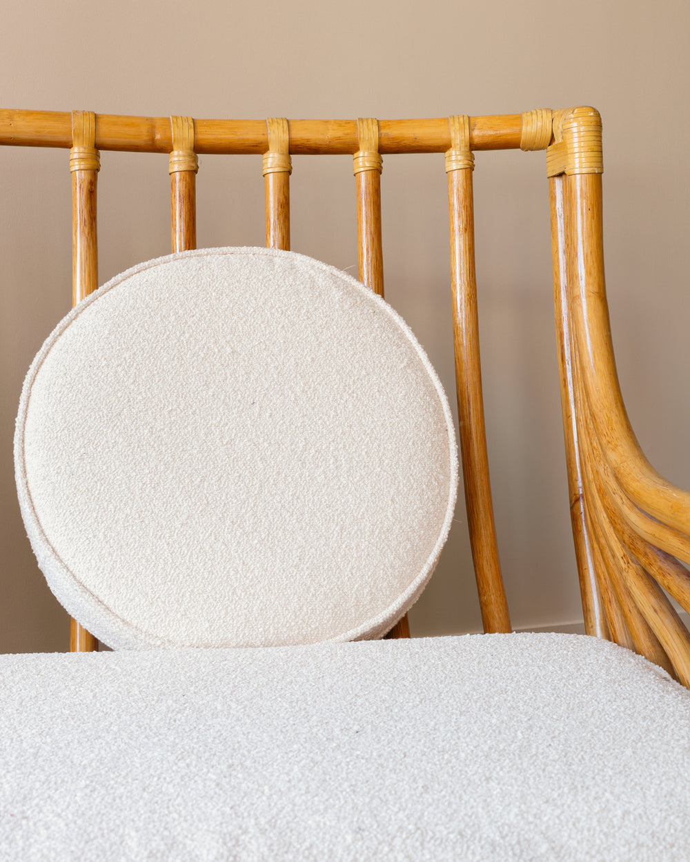 The design balances structure with a relaxed style, highlighting the warmth of natural bamboo against upholstered cushions in cream boucle.