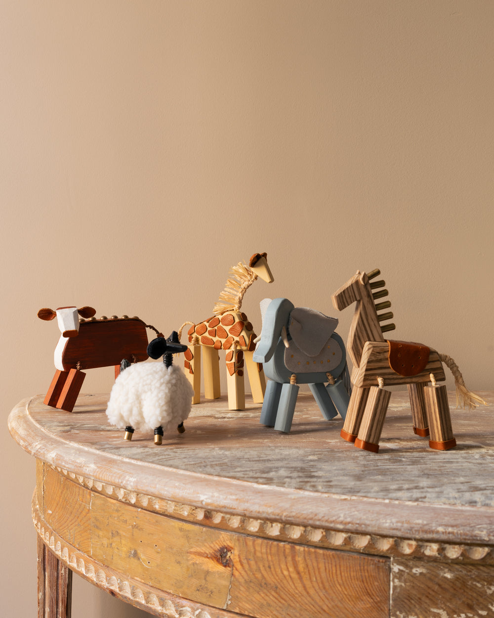 Handmade animal figure by Alicia Sciberras, a New York–based set designer and creative director whose sculptural objects draw inspiration from the world of interiors. Crafted in a limited run where no two pieces are exactly alike, each figure is individually shaped, painted, and assembled using materials familiar to interior detailing — timber, leather, suede, raffia, brass accents, paper cord, and hand-applied paint. Sciberras’s work blends playful form with a sculptural, craft-forward sensibility — small objects with the presence and clarity of design pieces.